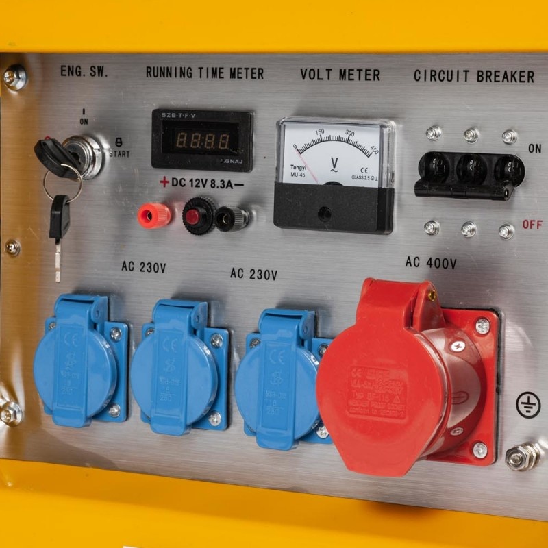 - Wenn Sie 230 Volt und 400 Volt zusammen verwenden, können Sie an den 2 230-Volt-Steckdosen maximal 3680 Watt (Dauer 3000 Watt) und an der 400-Volt-Steckdose maximal 6400 Watt (Dauer 5000 Watt) verbrauchen.