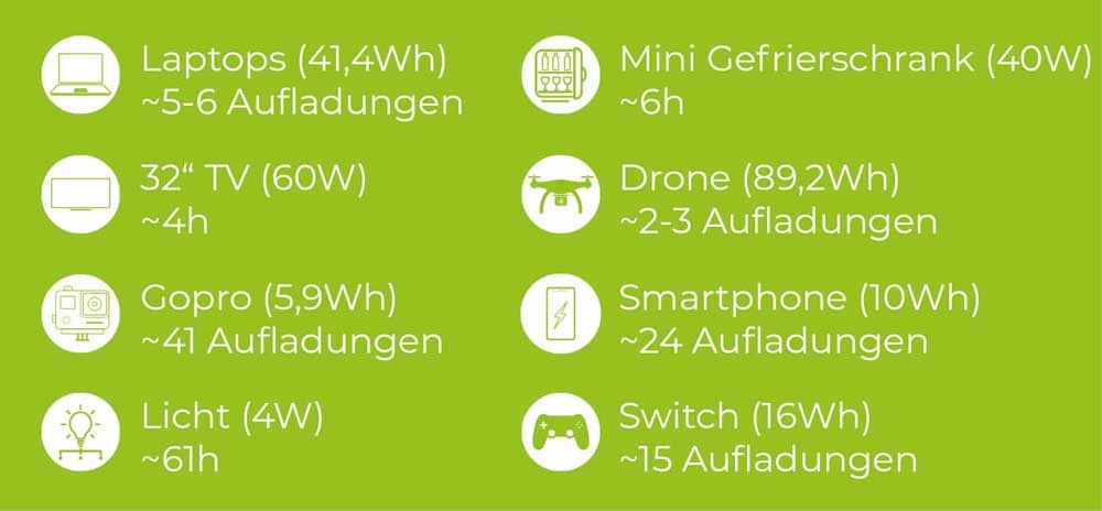 Lieferumfang: Powerstation, 60 W AC-Ladegerät, Autoladekabel (Zigarettenanzünder), MC4-Kabel (zur möglichen Nutzung von Solarpanels),