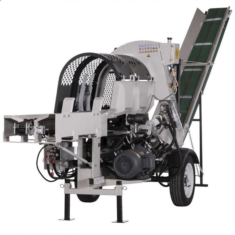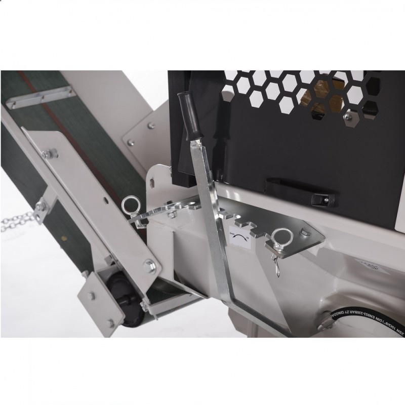 Die Maschine hat ein hydraulisches kettengetriebenes Zuführband (Holzzuführung bis zur Säge) und ein Abführband (nach dem Spalten).