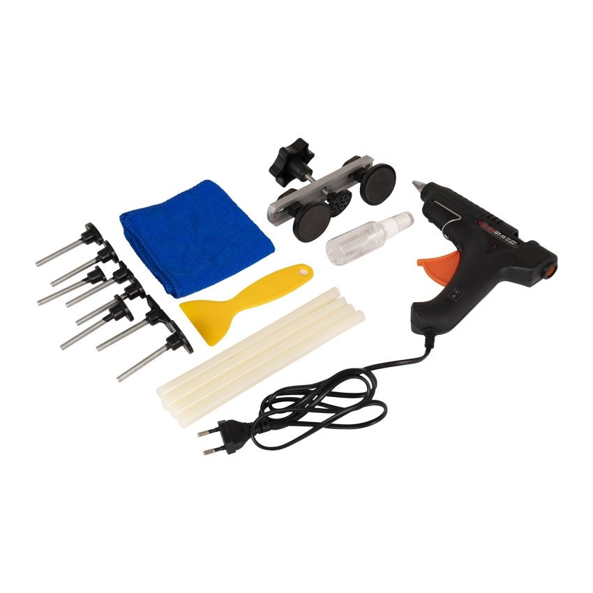 TOPGEAR DEUTK SET 16-TEILIG TOPGEAR Ausbeulset 16-teilig CKomplettes Set zum Entfernen von Dellen an der Karosserie. Set besteht aus: 1 Klebepistole 4 Klebestifte 1 Zugbrücke 1 Mikrofasertuch 1 Flasche Reinigungsflüssigkeit 8 Rakel 1 SchaberLesen Sie mehr