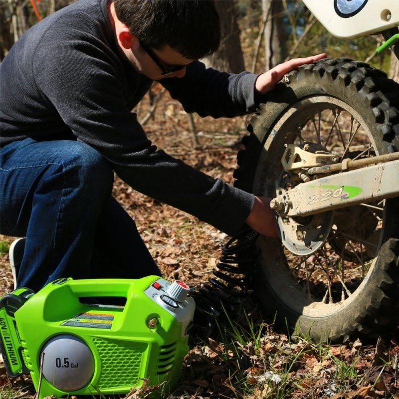 With the Greenworks 40 volt battery compressor type G40ACK2 you have a powerful battery compressor with a long working time.