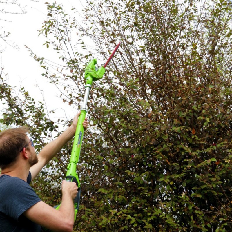 The hedge trimmer has a telescopic adjustable handle and gives you an extra long reach up to 240cm.