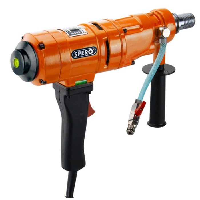 De boormachine is geheel uitgevoerd uit aluminium, om handmatig droog of watergekoeld gaten te boren in beton, gevelsteen etc. Deze betonboormachine is uitermate geschikt voor installatie en bouwbedrijven die zelf uiterst precies gaten met diamantboren willen boren.