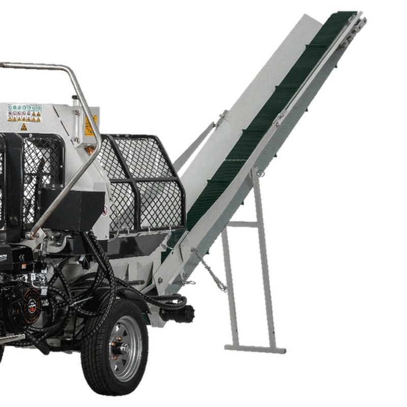 Daarna komt het hout op een 3,2 meter lange transportband die het naar een door u gewenste plaats transporteert (u maakt een berg met gekloofd hout of laat het hout direct in transport zakken of aanhanger vallen).
