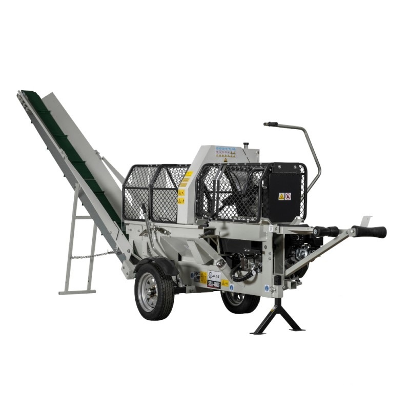 De machine zaagt uw hout op de gewenste lengte en klooft daarna het gezaagde stuk hout in 2 of 4 delen. Daarna worden de gekloven houtdelen via een transportband afgevoerd.