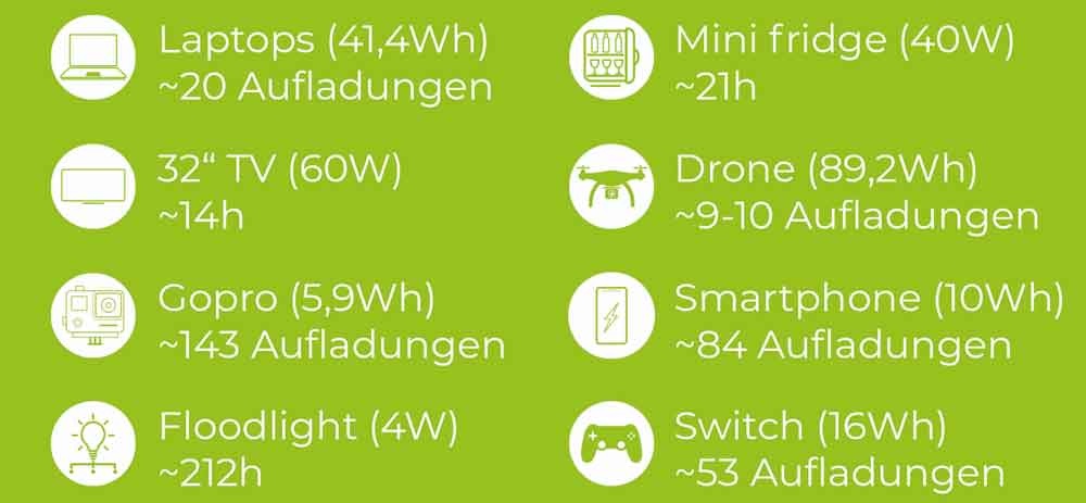 Leveringsomvang : powerstation, 150 W AC-lader, autolaadkabel (sigarettenaansteker), MC4-kabel (voor eventueel gebruik van zonnepanelen), optionele accessoires SP60W/SP120W (60 W /120 W zonnepaneel)