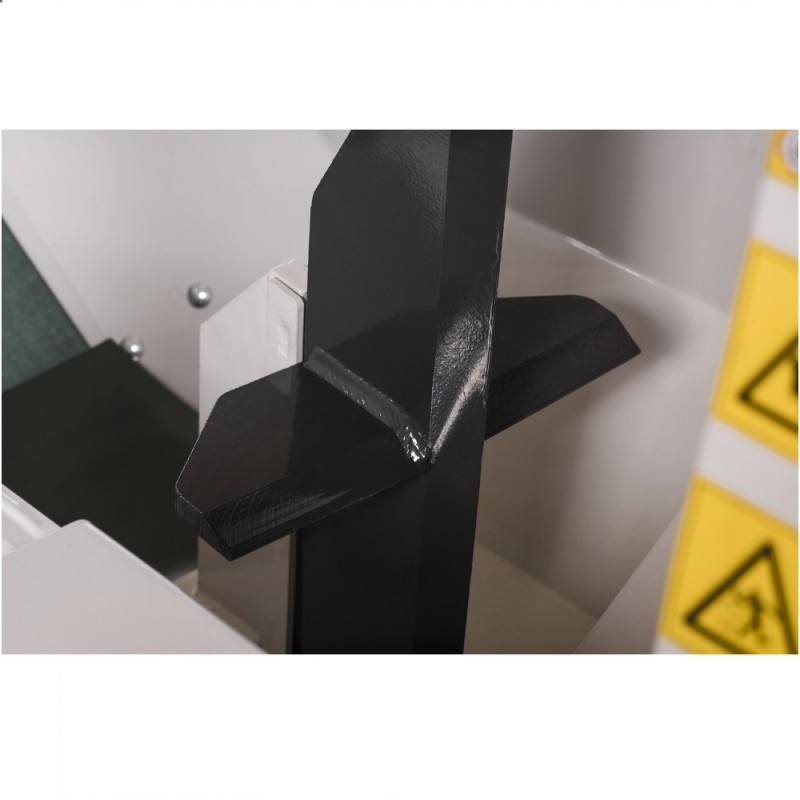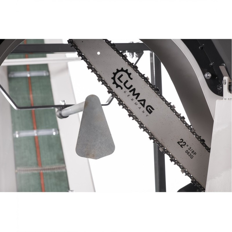 De machine heeft een hydraulische ketting aangedreven aanvoertransportband (hout aanvoer tot aan de zaag) en afvoer transportband (na het kloven).